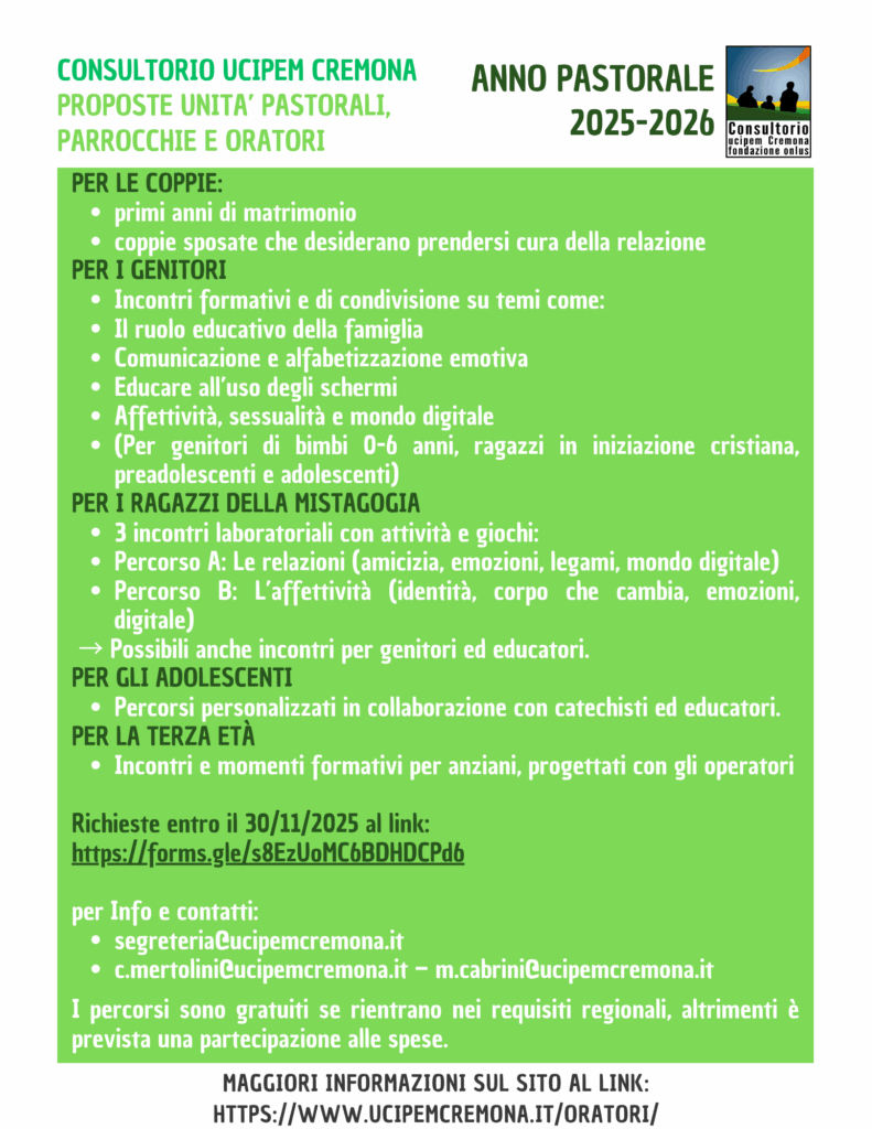 Il Consultorio UCIPEM sostiene e accompagna le Comunità e gli Oratori nel loro compito pastorale di sostegno alla famiglia attraverso modalità differenti che permettano il confronto e l’approfondimento di diverse tematiche legate alla crescita dei bambini e dei ragazzi, degli educatori/allenatori, della coppia e delle persone in differenti momenti del ciclo di vita.