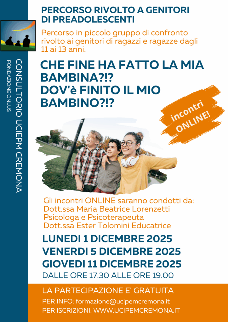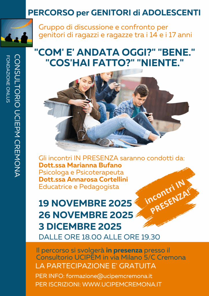 Il Consultorio UCIPEM sostiene la promozione umana e accompagna i genitori nel loro compito educativo attraverso modalità differenti che permettano il confronto e l’approfondimento di tematiche legate alla crescita dei figli e delle figlie e al ruolo genitoriale.