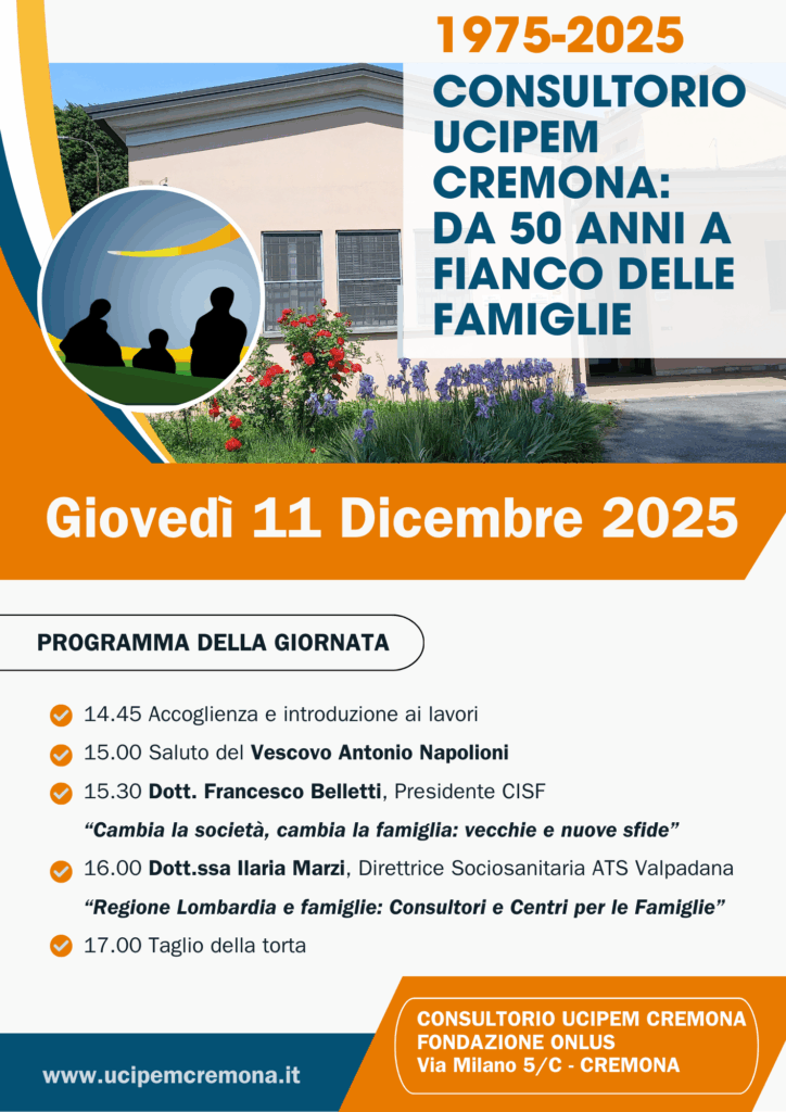 1975-2025 IL CONSULTORIO UCIPEM da 50 ANNI A FIANCO DELLE FAMIGLIE enti, genitori, news, oratori / Marta Lucchi 1975-2025 IL CONSULTORIO UCIPEM da 50 ANNI A FIANCO DELLE FAMIGLIE Leggi tutto »